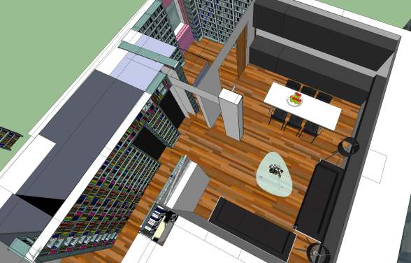 Totally refurbished ex-council flat in central London with views overlooking the city. It is designed as a "stage set" for an actress. The rooms open up for dinners, parties, and entertainment or the rooms can be close off into more private areas to use as a library, workroom, another bedroom, and so on.